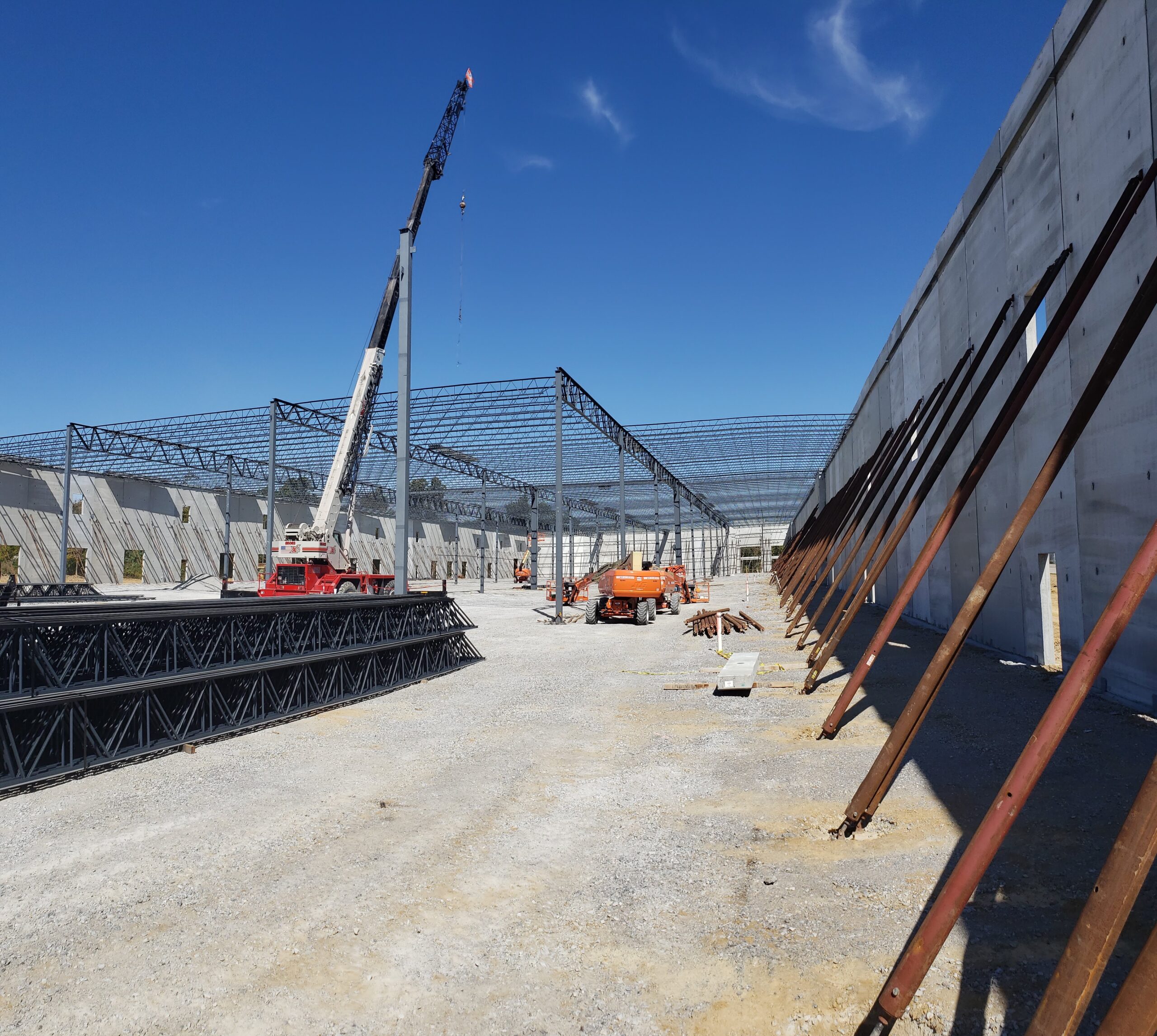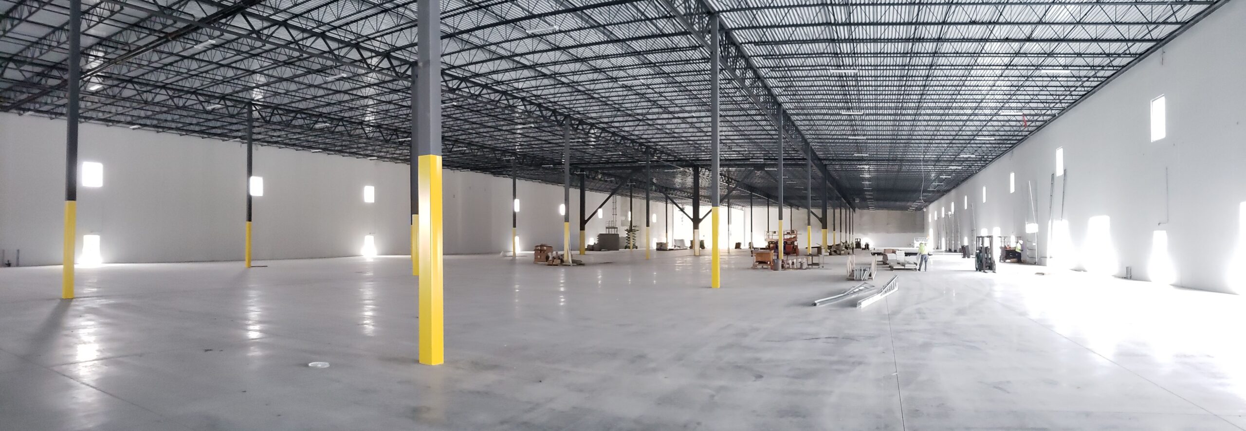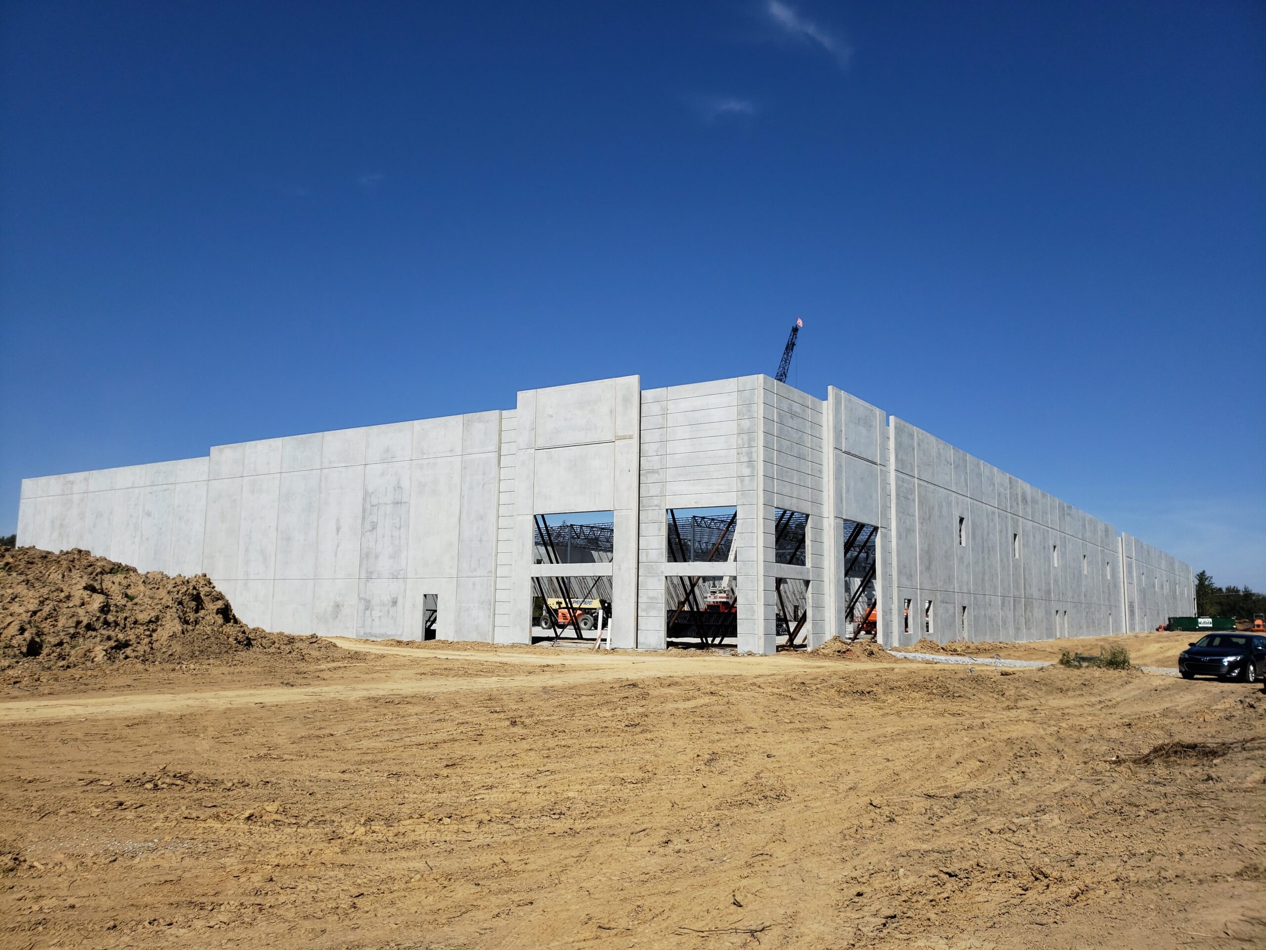 • Load-bearing precast concrete wall system — insulated precast exterior walls with EPS insulation; panels dropped to -5'0" at dock positions; top of front wall at 40'8"; full-height interior and exterior painting with two-color perimeter reveal scheme