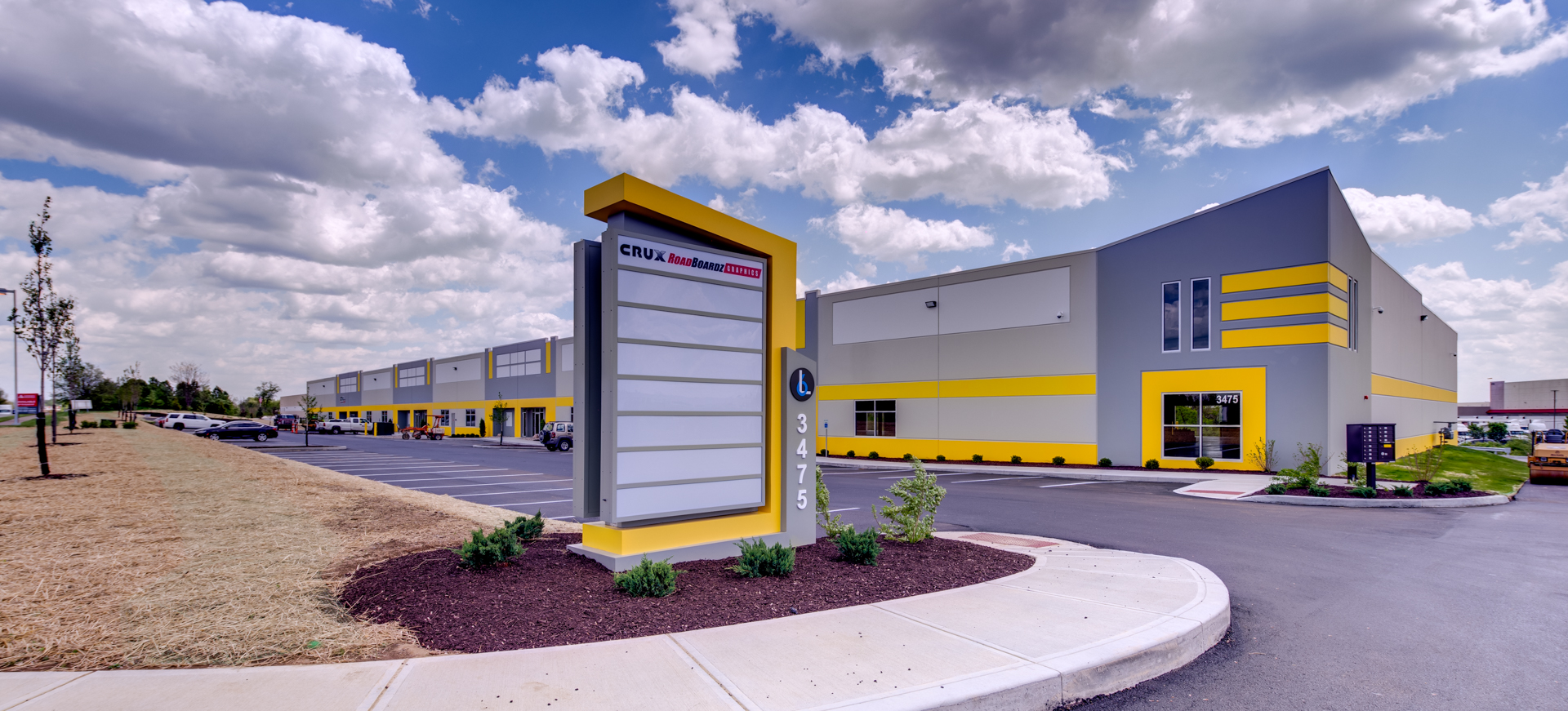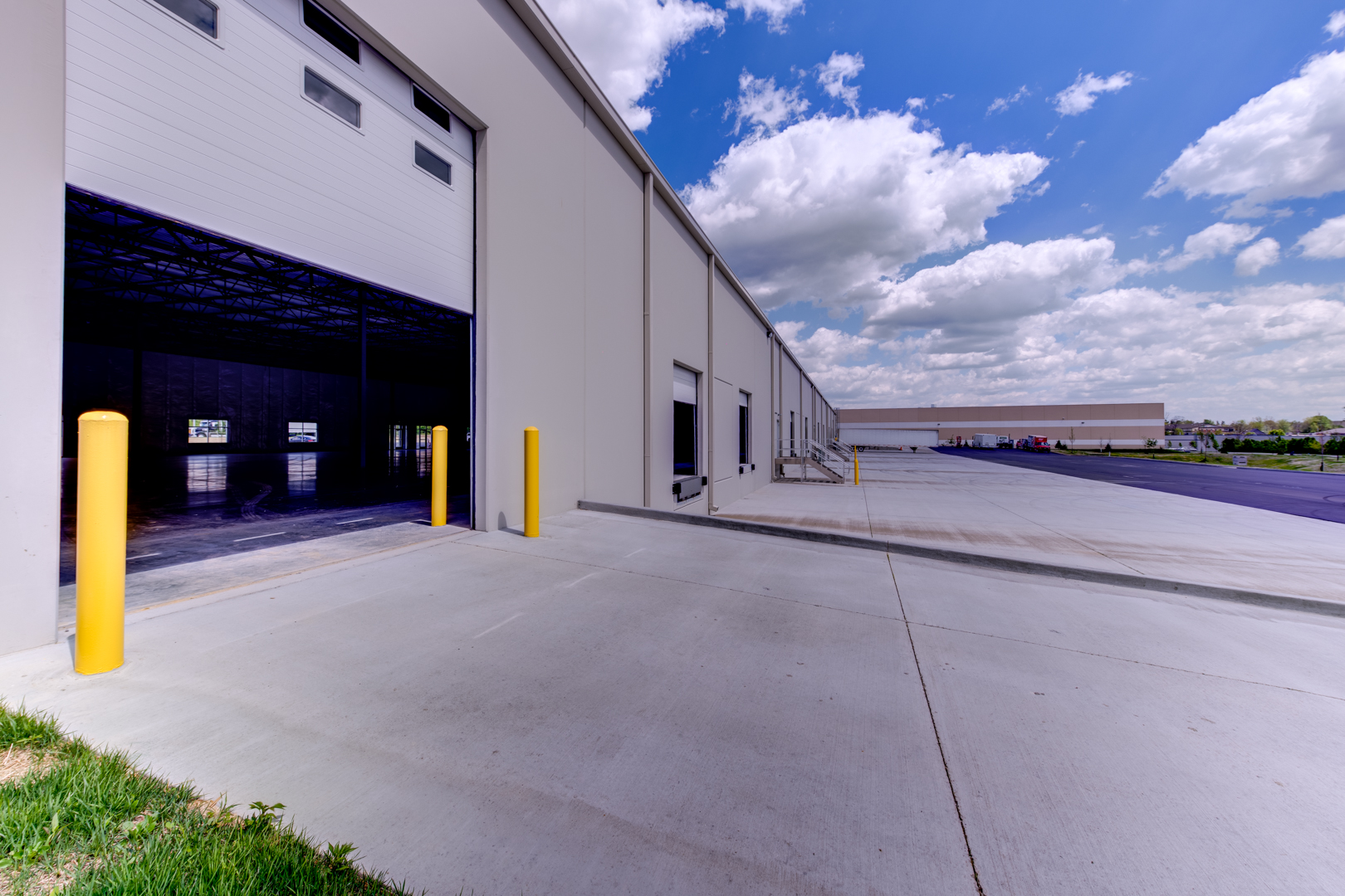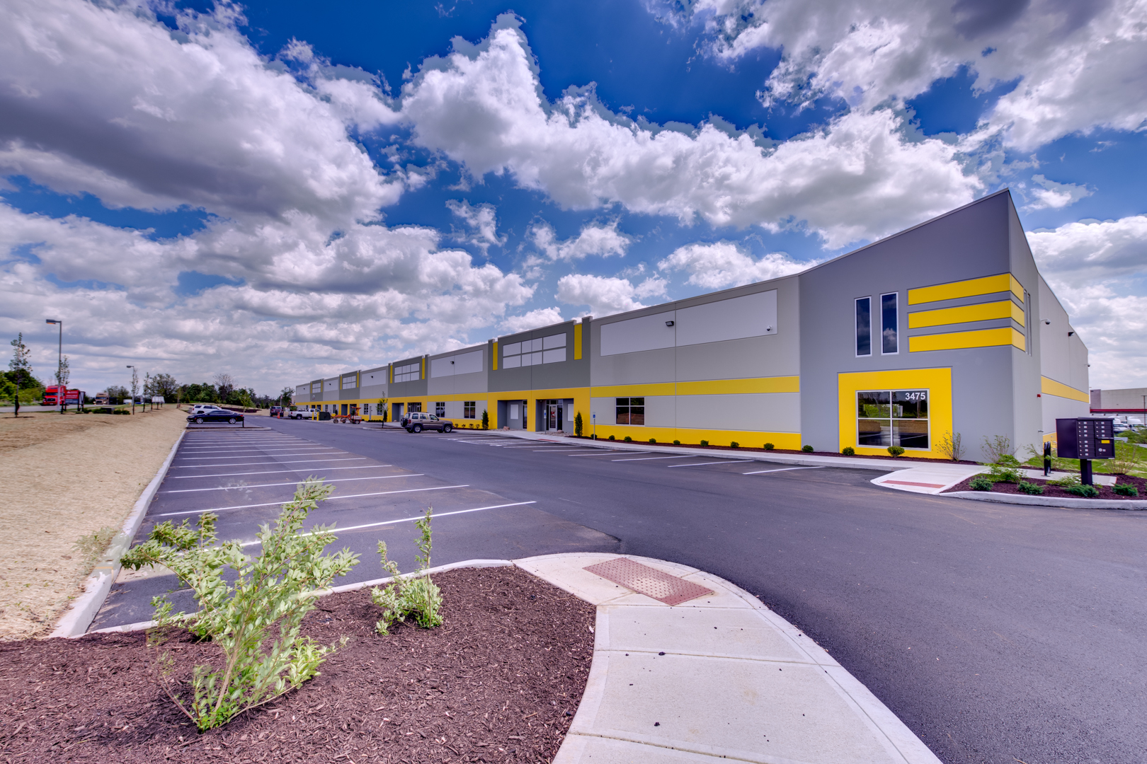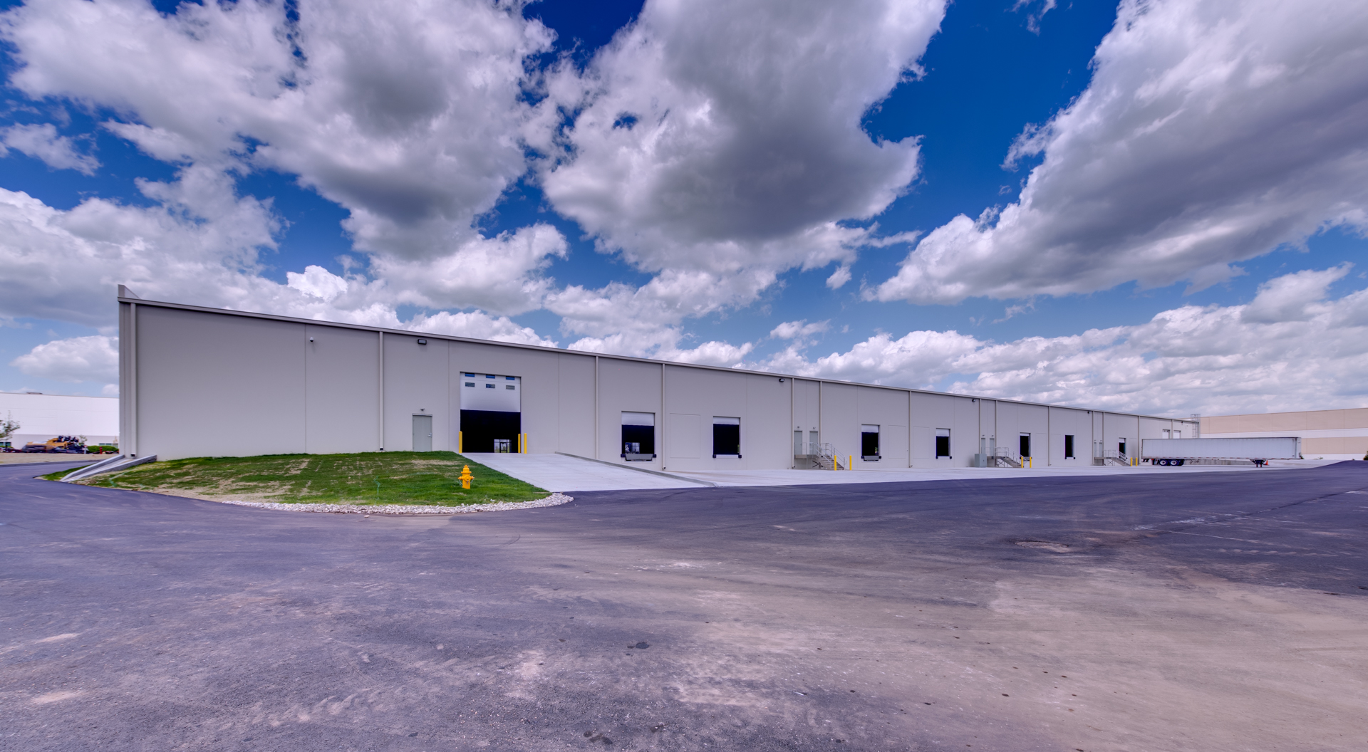 Paul Hemmer Company constructed Hardy World, a 64,600 SF speculative tilt-up warehouse building at Airpark West in Hebron, KY. The single-story building was designed to accommodate up to eight future tenant spaces and features a contemporary industrial program with dock-high loading, drive-in access, ESFR fire suppression, and gas-fired warehouse heating. The 475' × 136' structure provides 20-foot clear height at the low side with a maximum roof deck height of 26 feet. Paul Hemmer served as general contractor and construction manager. The site work included significant grading, lime stabilization, modular block retaining walls, and full utility infrastructure including water, sanitary, storm, gas, and electrical service.