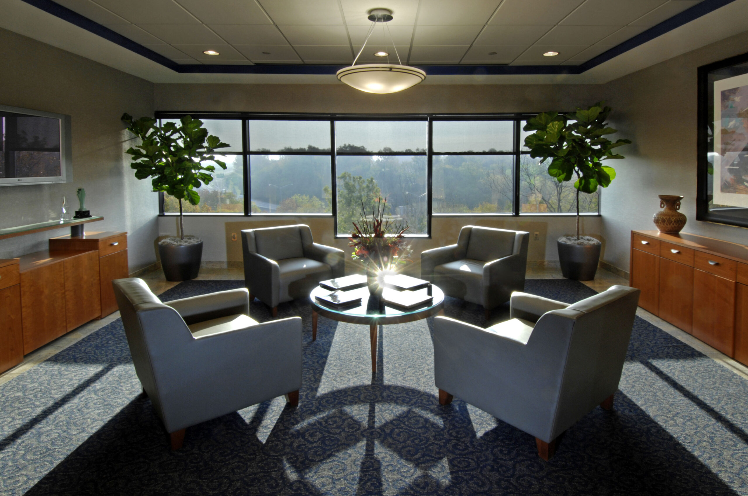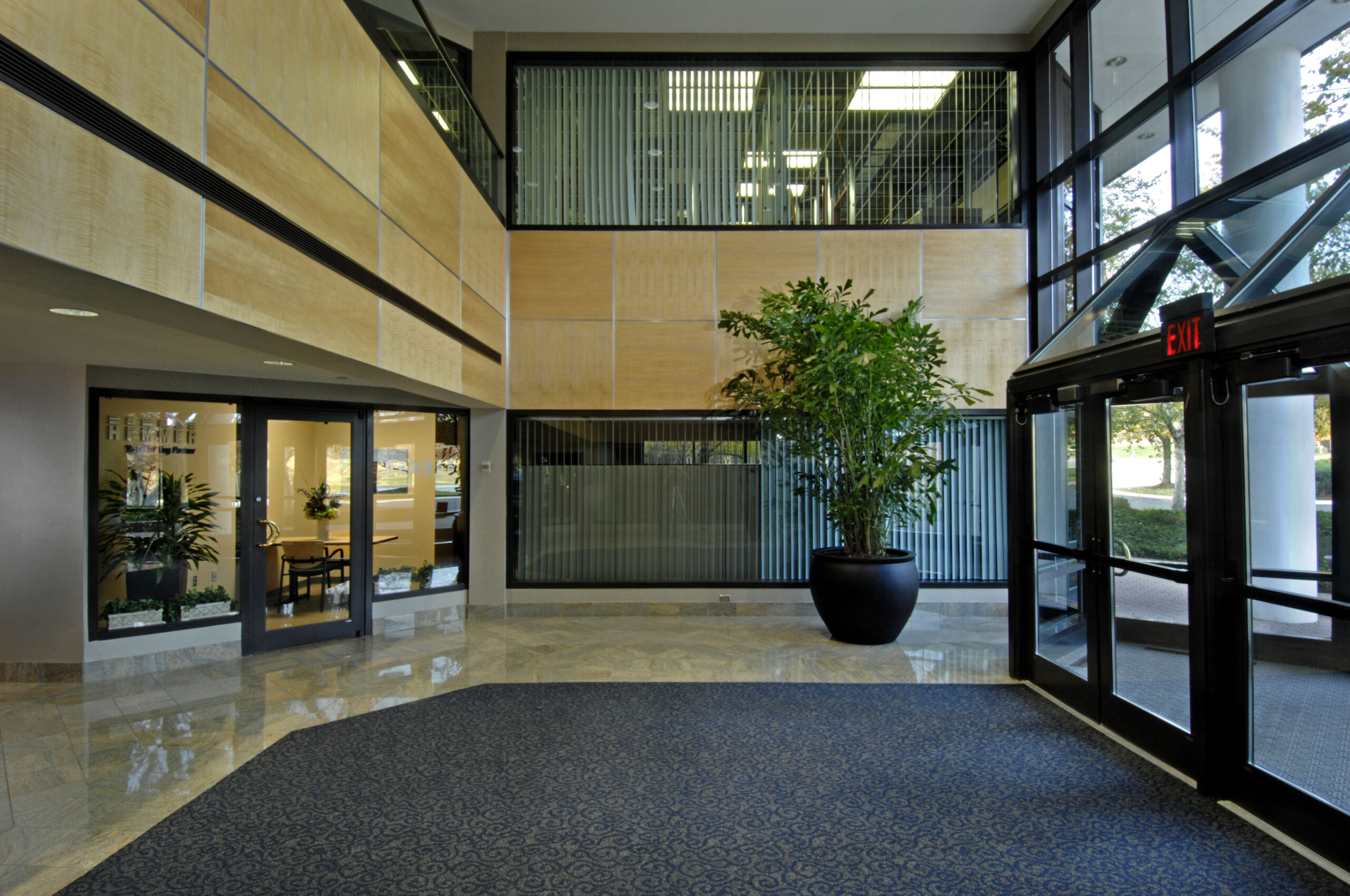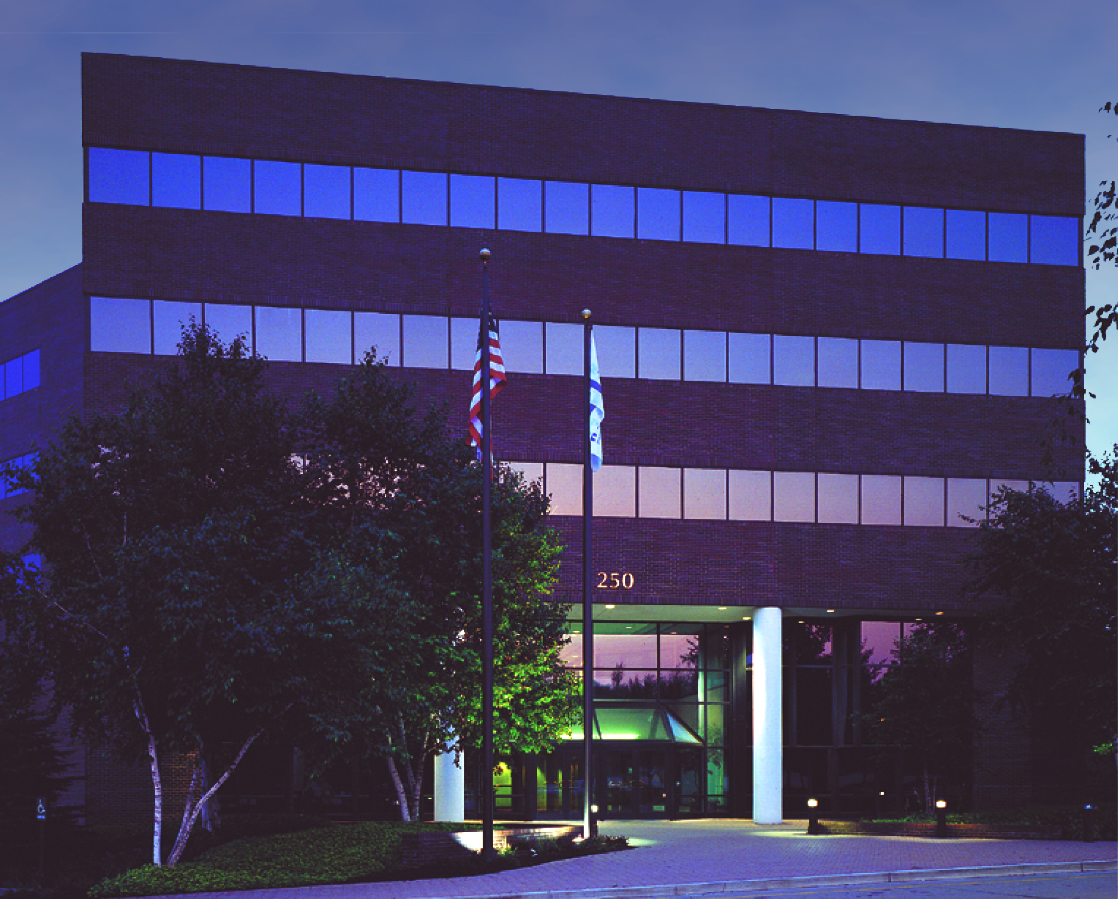- Full-height aluminum curtain wall system on the front (northwest) elevation with 1" insulated reflective vision glass and reflective spandrel panels