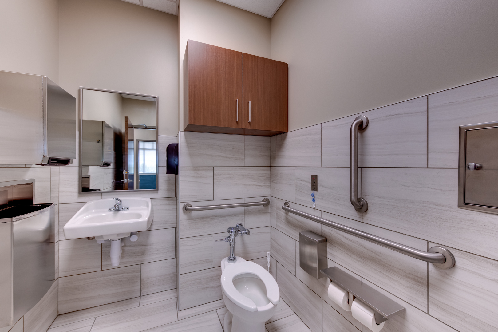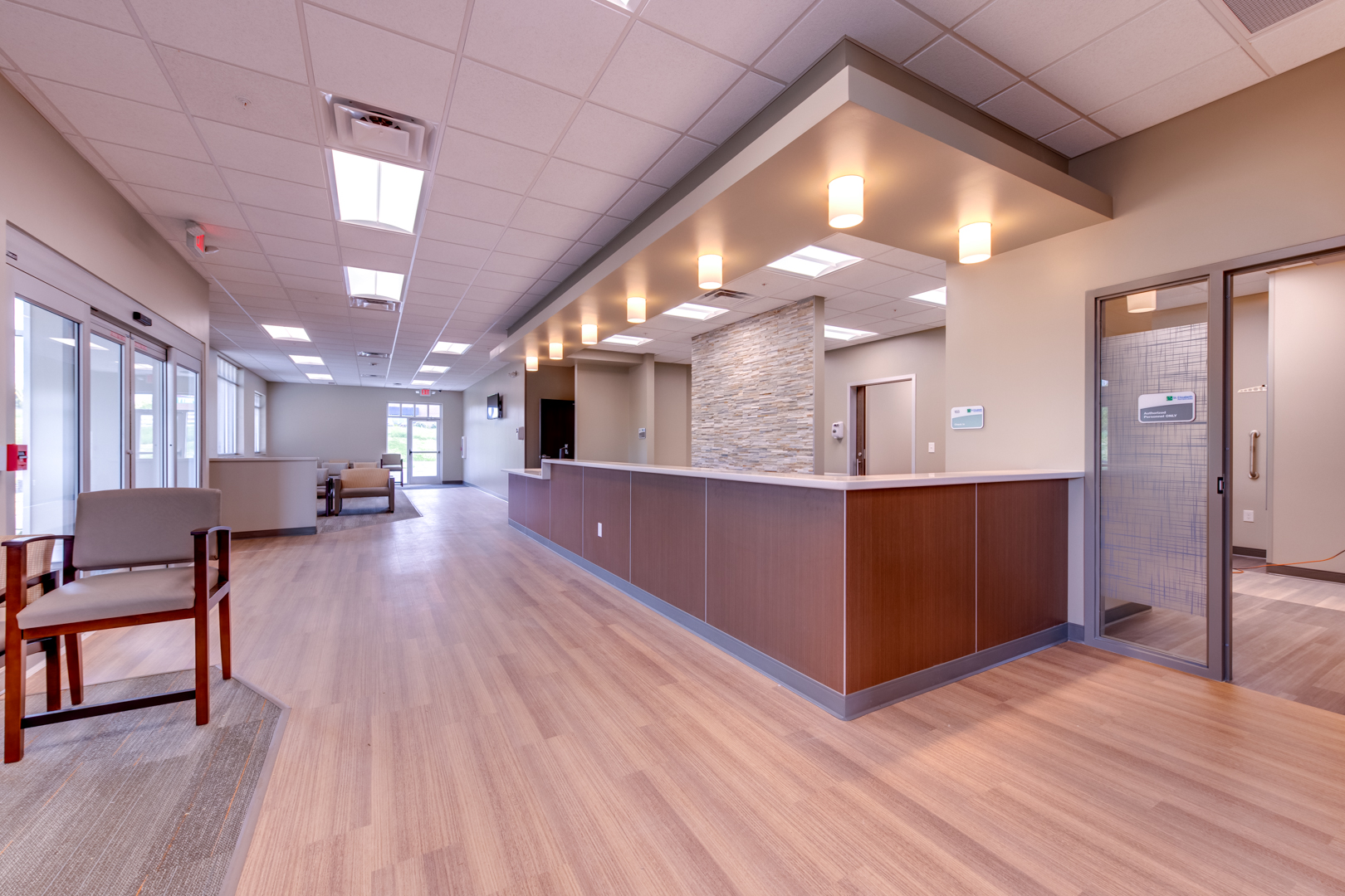 - High-quality interior finishes to St. Elizabeth design standards: Interiors were built to St. Elizabeth Physicians' established design standards, featuring stone veneer, acrylic panels, and multi-color accents at floors and walls, all solid surface counters and tops, a 2x2 acoustic ceiling with 7/8" reveal edge at NRC 0.70, and LED lighting throughout including dimmable and motion-controlled can fixtures. Patient rooms feature acrylic panels and decorative puck lights.
